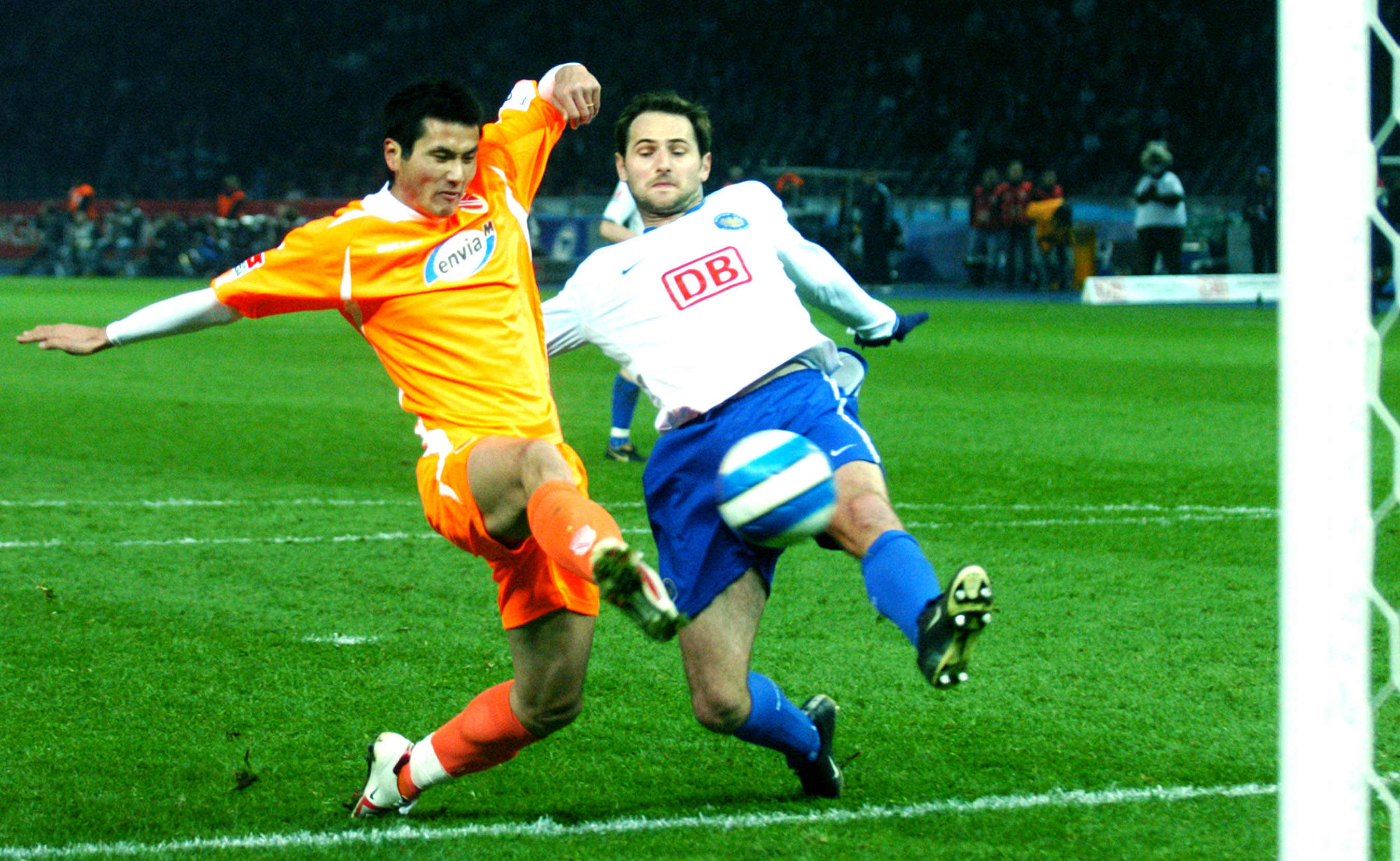 2007年3月16日,在德甲科特布斯队效能的邵佳一(左)在比赛中射门。新华社记者 吴晓凌 摄