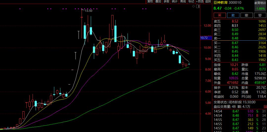 松手2024年12月20日收盘,豆神训导股价8.47元/股,总市值175亿元。