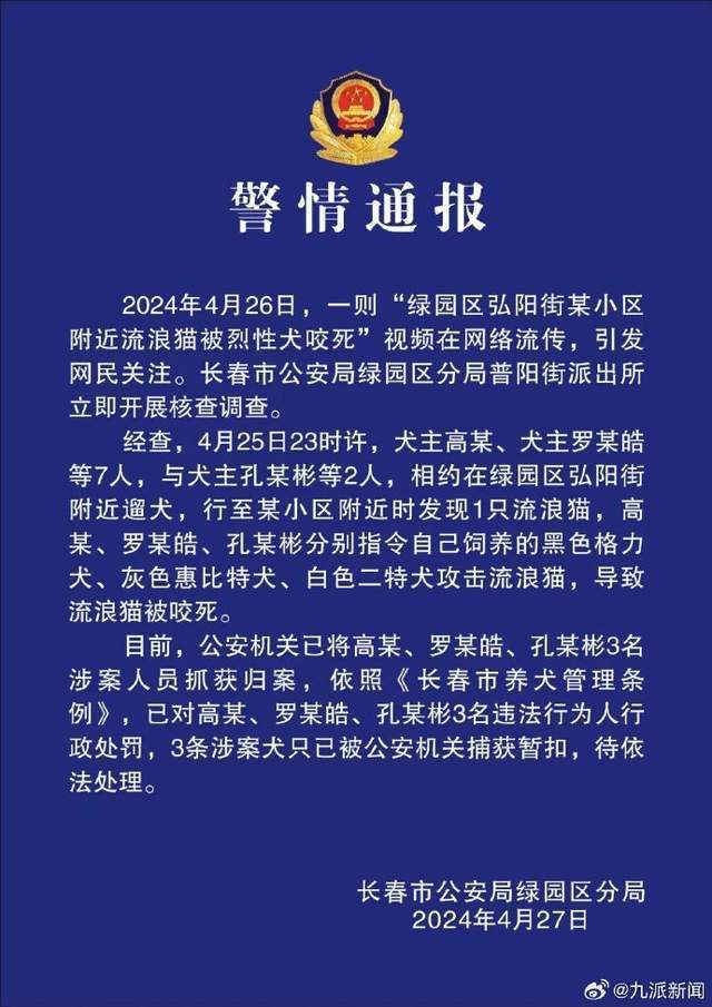 4月27日,长春市公安局绿园分歧局发布警情通报:2024年4月26日赌钱赚钱app,一则“绿园区弘阳街某小区隔邻流浪猫被烈性犬咬死”视频在网罗流传,激励网民眷注。长春市公安局绿园分歧局普阳街派出所立即开展核查探听。经查,4月25日23时许,犬主高某、犬主罗某皓等7东说念主,与犬主孔某彬等2东说念主,相约在绿园区弘阳街隔邻遛犬,行至某小区隔邻时发现1只流浪猫,高某、罗某皓、孔某彬分别提醒我方饲养的玄色格力犬、灰色惠比特犬、白色二特犬时弊流浪猫,导致流浪猫被咬死。当今,公安机关已将高某、罗某皓、孔某彬3名涉案东说念主员捏获归案,依照《长春市养犬处治条例》,已对高某、罗某皓、孔某彬3名犯法四肢东说念主行政处罚,3条涉案犬只已被公安机关拿获暂扣,待照章处理。